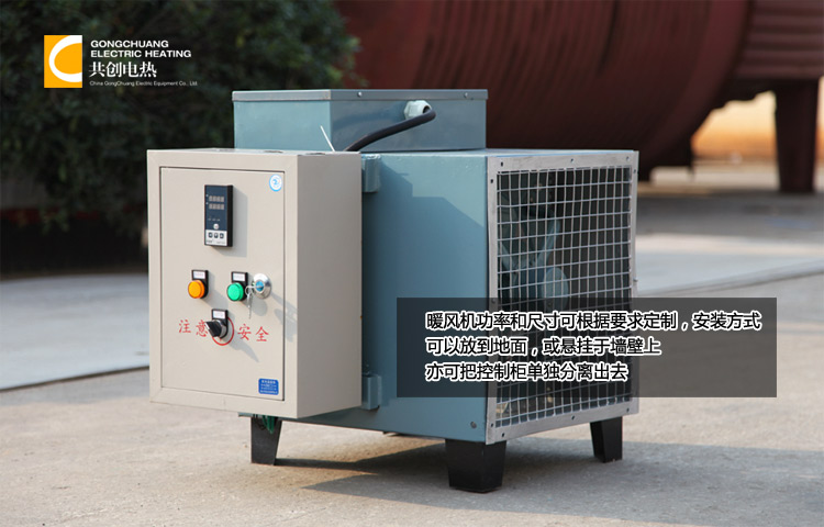 暖风机是一款固定在墙壁或棚顶上使用的电热取暖产品,适合厂房、车库、地下室、烘干室等场所使用。暖风机通过风机的旋转,强制空气循环,有利于空气的加热,适合间断采暖的场所使用。设备上配置开关,但如果安装高度过高,直接在设备上操作不方便,订货时可选择将开关安装在墙壁上的线控机型。需要新风换气的场所,可以将设备与新风管道进行连接,通过风阀调节新风量。固定在墙壁或者棚顶上使用,节约地面空间,选择吊挂在棚顶上的安装方式,订货时请声明。