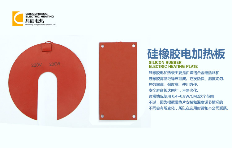 硅橡胶电加热板 硅橡胶电加热板主要是由镍铬合金电热丝和硅橡胶高温绝缘布组成。它发热快、温度均匀、热效率高、强度高、使用方便、寿命长达四年,不易老化。通常情况使用 0.4~0.8W/cm2这个范围比较合适。不过,因为根据发热片安装和温度调节情况的不同会有所变化,所以在选用时请和本公司联系。